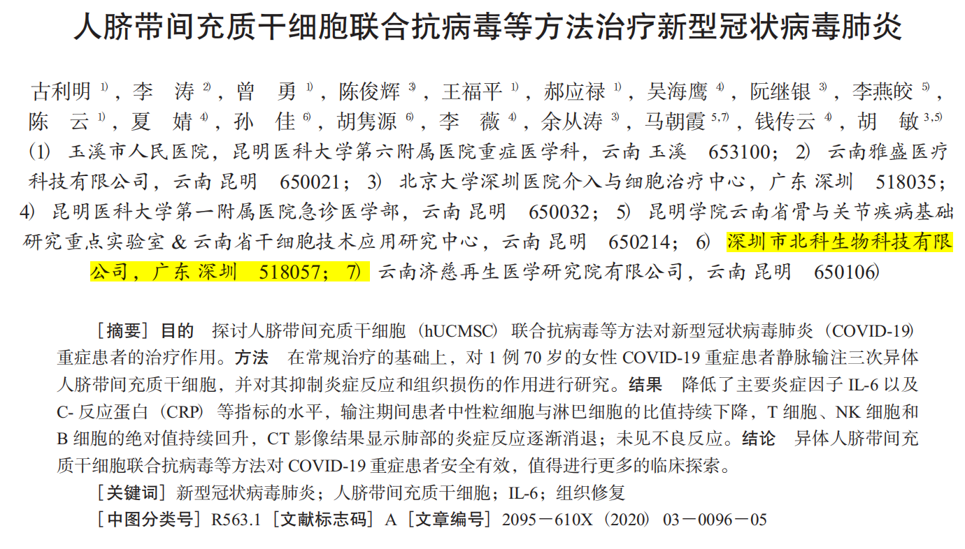 在疫情期間,北科生物也積極參與技術(shù)攻關(guān),與云南多家醫(yī)療機(jī)構(gòu)聯(lián)合開展的間充質(zhì)干細(xì)胞治療新冠肺炎危重癥患者的臨床研究也已取得階段性成果,并發(fā)表《人臍帶間充質(zhì)干細(xì)胞聯(lián)合抗病毒等方法治療新型冠狀病毒肺炎》文章。