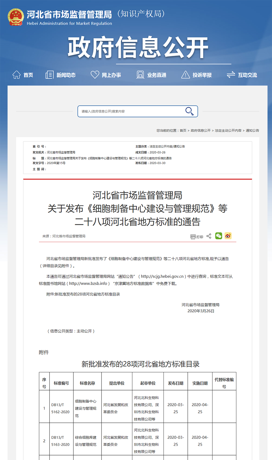 3月25日,河北省市場(chǎng)監(jiān)督管理局發(fā)布通知,《細(xì)胞制備中心建設(shè)與管理規(guī)范》(編號(hào):DB13/T5162-2020)、《綜合細(xì)胞庫(kù)建設(shè)與管理規(guī)范》(編號(hào):DB13/T5163-2020)正式批準(zhǔn)發(fā)布,將于4月25日正式實(shí)施。兩項(xiàng)標(biāo)準(zhǔn)是河北省標(biāo)準(zhǔn)化體系建設(shè)的重要組成部分之一,由河北省市場(chǎng)監(jiān)督管理局組織,河北省發(fā)展和改革委員會(huì)提出,河北北科生物科技有限公司,深圳市北科生物科技有限公司、個(gè)體化細(xì)胞治療技術(shù)國(guó)家地方聯(lián)合工程實(shí)驗(yàn)室(深圳)共同編制完成。