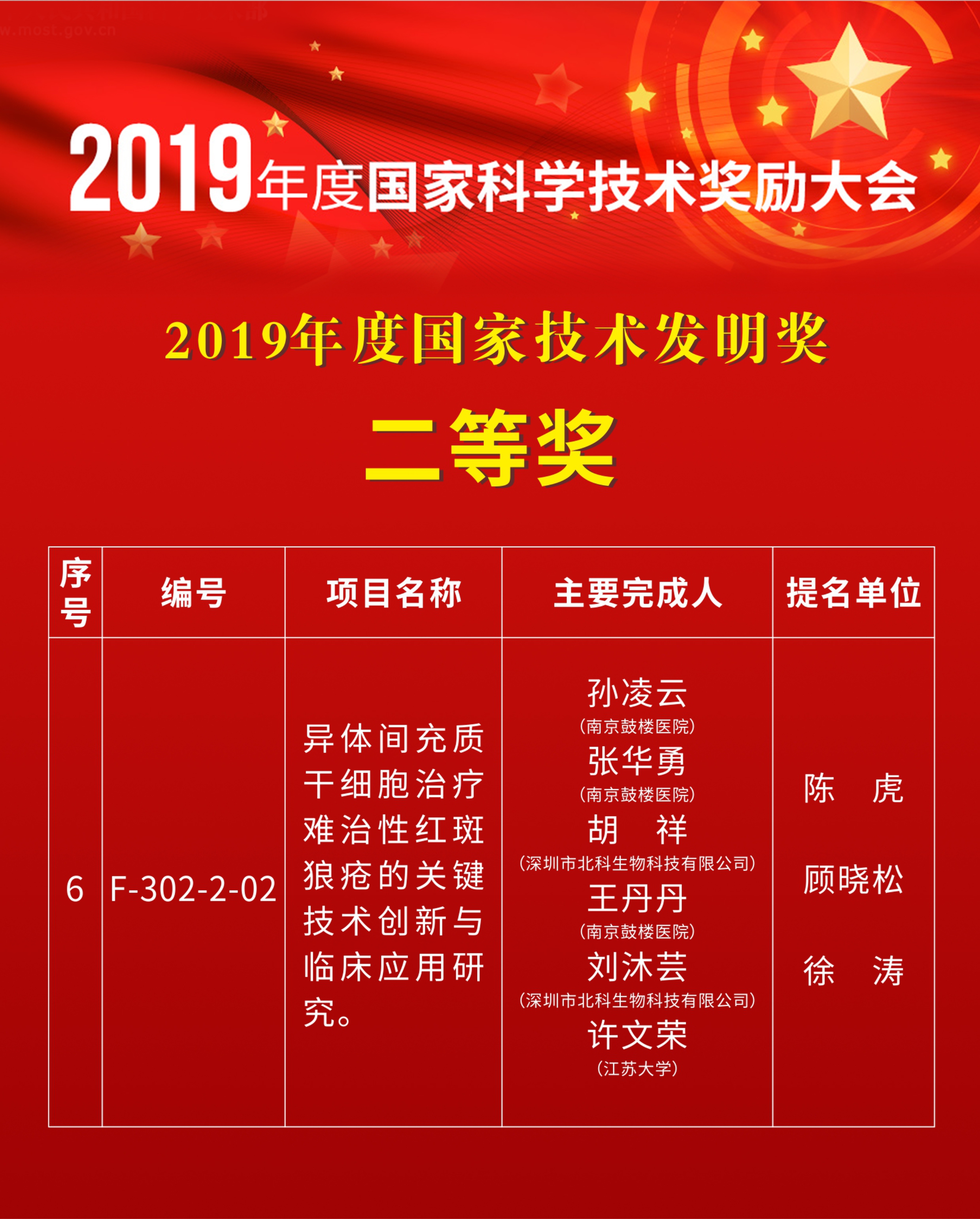 2020年1月10日,中共中央、國務(wù)院在北京舉行2019年度國家科學(xué)技術(shù)獎勵大會,這是科技界一年一度的盛宴,是中國科技界的最高榮譽,是黨和人民對科技工作者的最高褒獎。南京大學(xué)醫(yī)學(xué)院附屬鼓樓醫(yī)院風濕免疫科孫凌云,張華勇,深圳市北科生物科技有限公司胡祥、鼓樓醫(yī)院王丹丹、北科生物劉沐蕓、江蘇大學(xué)許文榮等共同完成的成果“異體間充質(zhì)干細胞治療難治性紅斑狼瘡的關(guān)鍵技術(shù)創(chuàng)新與臨床應(yīng)用研究”榮獲國家技術(shù)發(fā)明二等獎。
