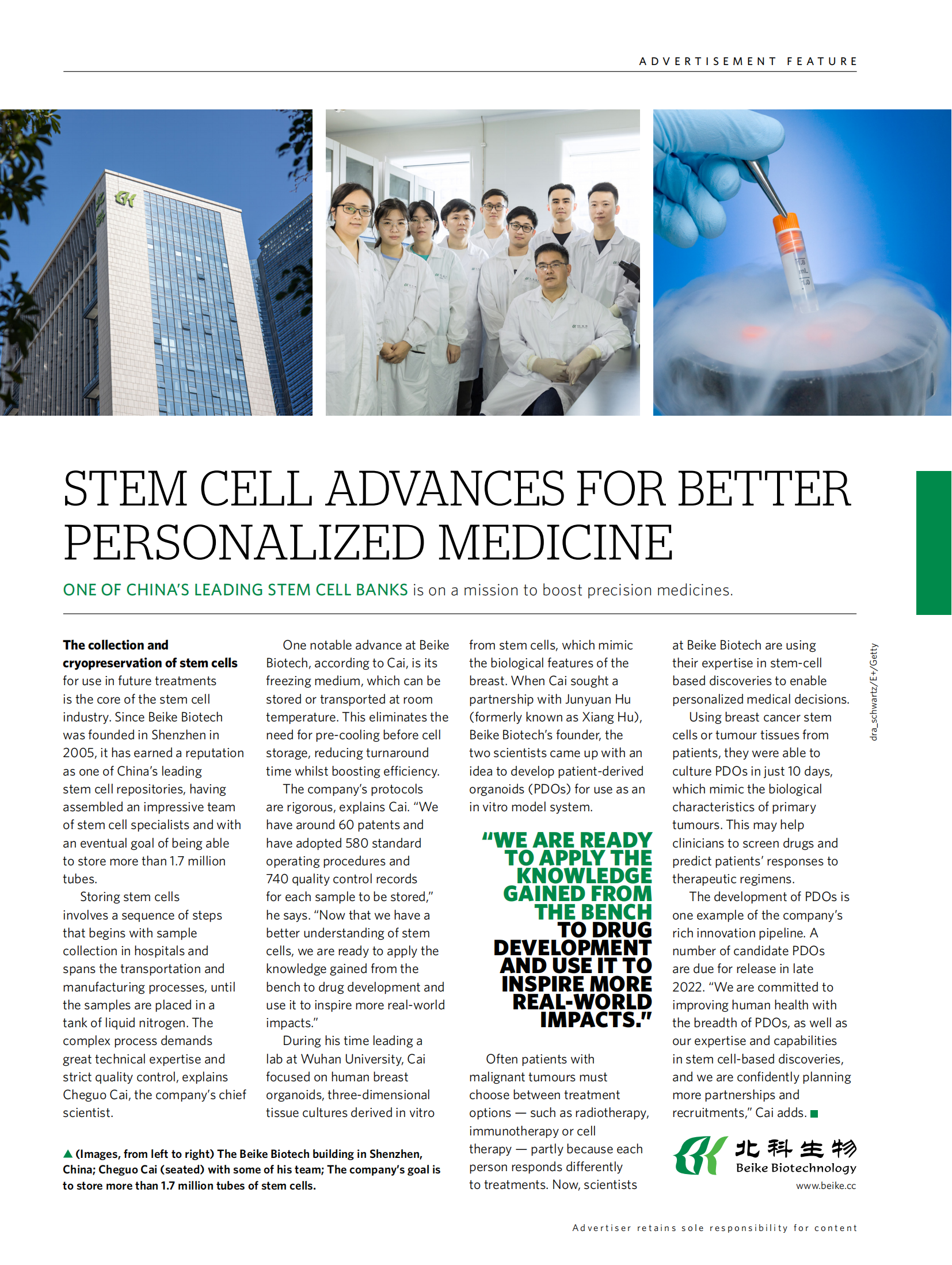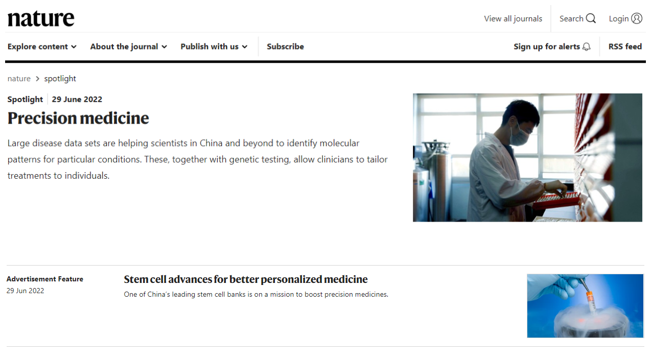 2022年6月29日,《Nature》官網(wǎng)nature spotlight增刊的“自然聚焦-中國(guó)精準(zhǔn)醫(yī)療”板塊在線發(fā)表了北科生物首席科學(xué)家蔡車國(guó)教授團(tuán)隊(duì)的主題文章:干細(xì)胞進(jìn)展推動(dòng)更好的個(gè)性化醫(yī)療。干細(xì)胞進(jìn)展推動(dòng)更好的個(gè)性化醫(yī)療
